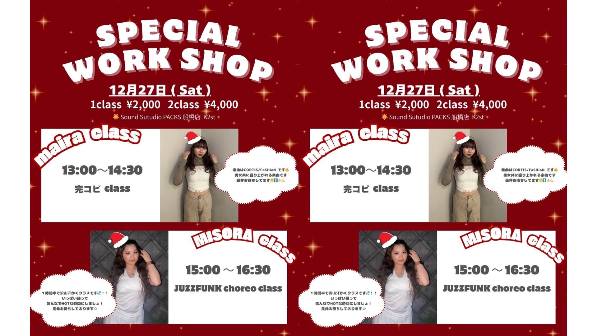 ✨MISORA & maira スペシャルワークショップ開催!✨ MISORA と maira による、年末スペシャルWSを開催します!🔥 今回のWSはmaira先生の完コピ、MISORA先生のコレオとなります。当スクール以外の経験者の方も参加OK! 🕒 クラススケジュール 日程:2025年12月27日(土) 13:00〜14:30 maira class(CORTIS / FaSHioN 完コピ) 15:00〜16:30 MISORA class(JAZZFUNKコレオ) 場所:SCD 船橋校 K2スタ ...